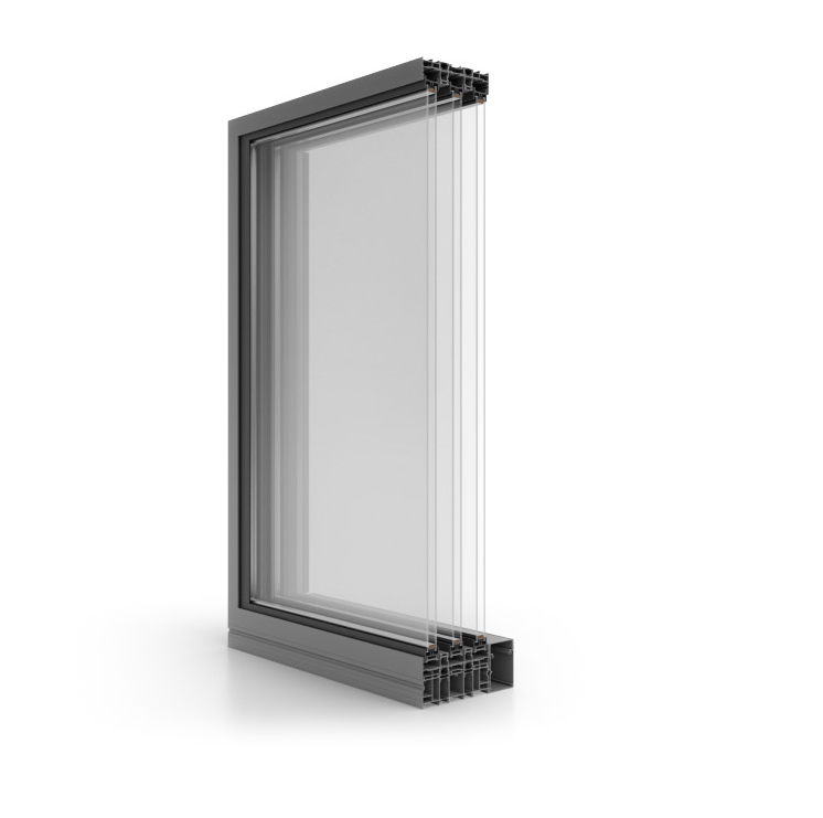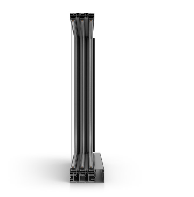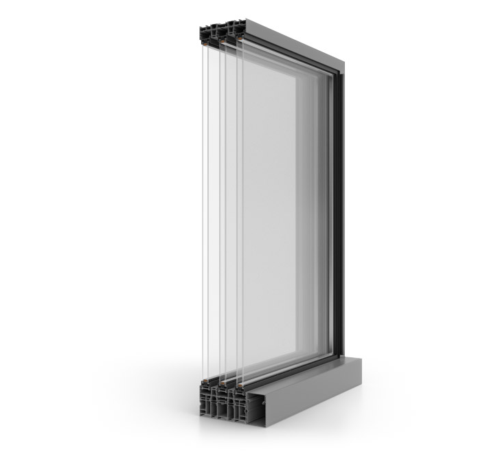 Eine Besonderheit des Systems ist die verstärkte Inox-Schiene, die die Möglichkeit bietet, größere und schwerere Türflügel zu verwenden, und die ein sanftes Gleiten ermöglicht, um die Lebensdauer des Systems zu verlängern. Sie ist eine wesentliche Voraussetzung für die Realisierung der dreispurigen Variante.